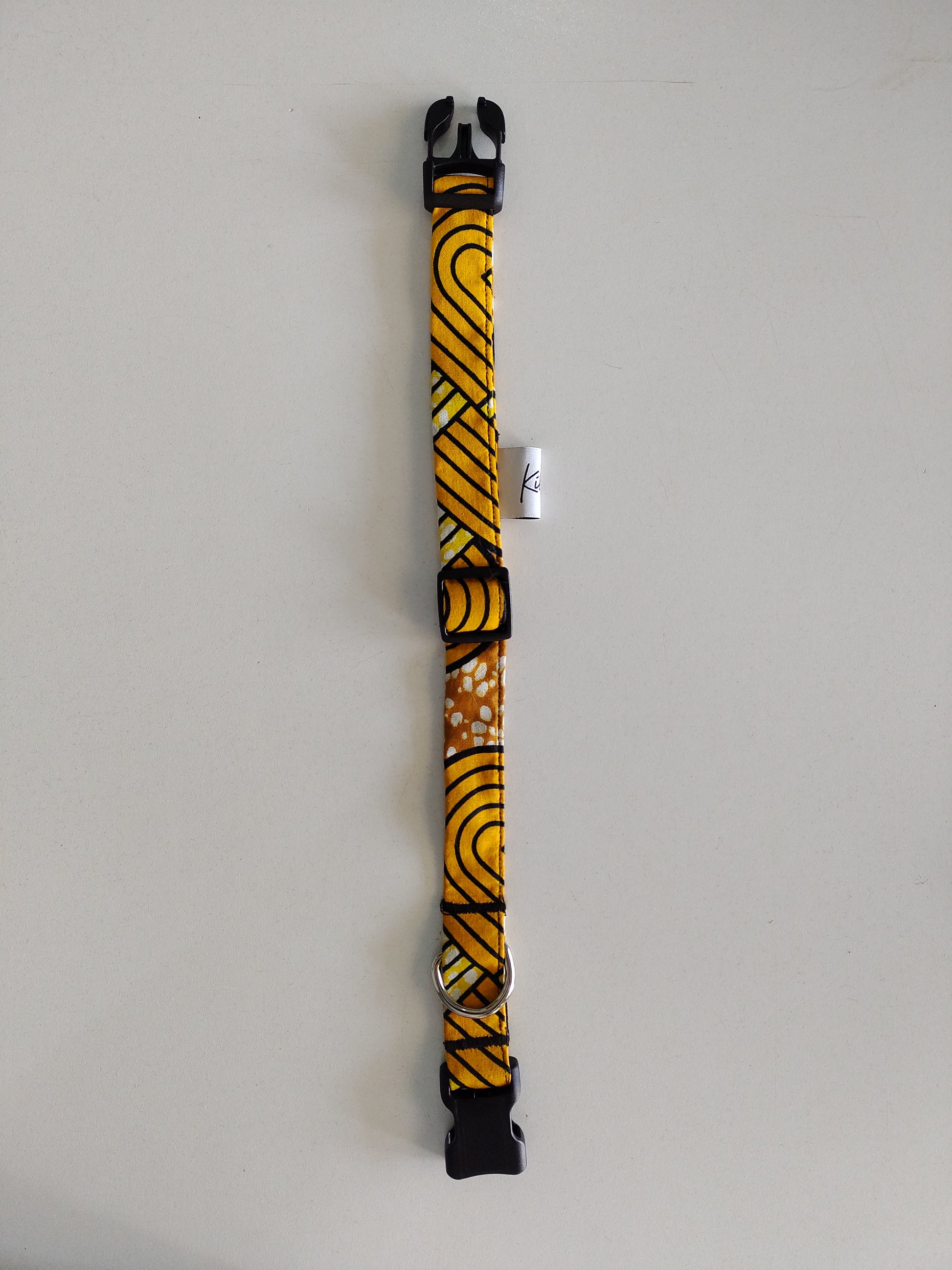 Don’t let your pet pooch miss out on a slice of sustainable fashion. This adjustable Dog Collar made of nylon webbing covered in chitenje fabric; with US-manufactured hardware, is suitable for larger dogs (neck size 40-56 cm, 15-22 in). It is attached easily to any leash so you can both strut in style.